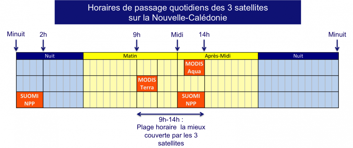 Le tableau ci-dessous indique les horaires de passage les plus fréquents des différents satellites. Les capteurs Aqua et Terra ont une revisite quotidienne alors que Suomi Npp passe deux fois par jour sur la Nouvelle-Calédonie.