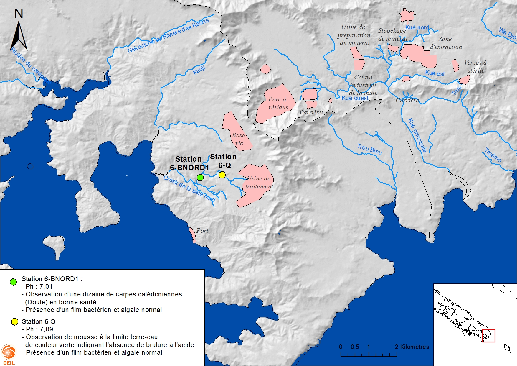 Soucieux de déceler tout éventuel impact sur l’environnement, l’OEIL s’est rendu le 10 mai au matin sur le terrain, sur deux stations situées en amont du creek baie Nord (station 6-BNord1 et station 6-Q), accompagné par Yannick Dominique (hydrobiologiste du bureau d’études Biotop) et Nicolas Marin (ingénieur membre du Comité Consultatif Coutumier Environnemental).
