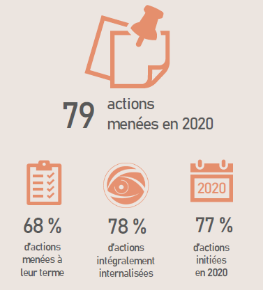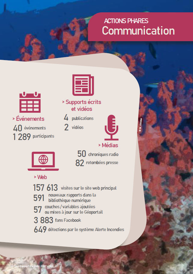 Les productions phares, telles que les diagnostics environnementaux, les suivis des principales pressions, et les brochures grand public diffusant leurs résultats ont pu être maintenues. Le taux d'accomplissement des actions est remarquable dans un contexte globalement très difficile. Toutefois, certaines actions ont dû être reportées, voire annulées, notamment : le développement d'indicateurs, les programmes d'acquisition de connaissances, le suivi de l'artificialisation des sols en province Sud en 2020, le suivi participatif Acropora des récifs coralliens du Grand Sud...