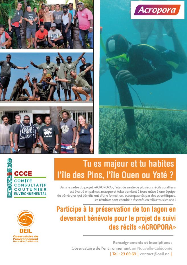 Dans le cadre du suivi ACROPORA, le CCCE et l'OEIL recherchent des bénévoles de Yaté, de l'île Ouen ou de Yaté pour suivre l'état des récifs du Grand Sud.