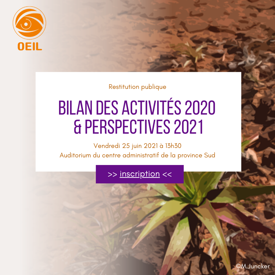 L'OEIL propose une restitution publique de son bilan 2020 et une présentation prospective de son plan d'action en 2021. Cet événement ouvert à un large public se tiendra le vendredi 25 juin à 13h30 à l'Auditorium de la province Sud, partenaire de l'évènement.