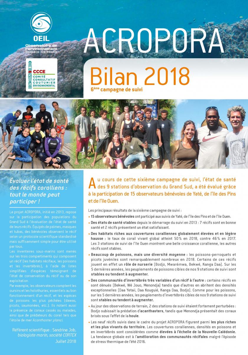 « Les neufs récifs suivis dans le cadre du projet ACROPORA figurent parmi les plus riches et les plus vivants du territoire. Les couvertures coralliennes, densités en poissons et en invertébrés sont considérées comme élevées à l’échelle de la Nouvelle-Calédonie. La tendance globale est à l’amélioration des communauté récifales malgré l’épisode de stress thermique de l’été 2016 », conclue Sandrine Job, biologiste marin du bureau d’études Cortex, qui réalise les suivis Acropora depuis 2013 sous l’égide de l’OEIL et du CCCE.