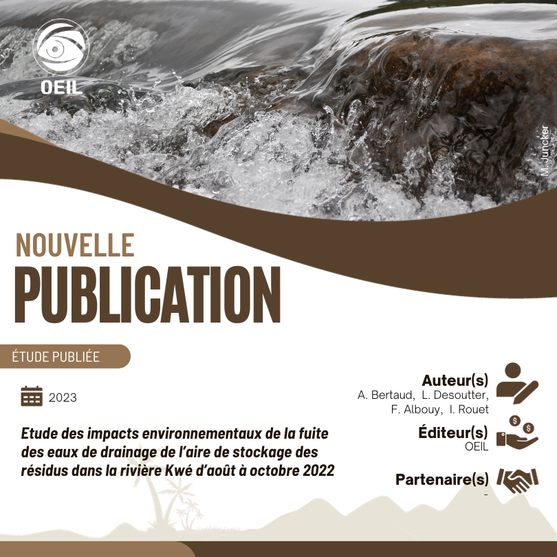 L'OEIL vient de publier l'étude suivante : Etude des impacts environnementaux de la fuite des eaux de drainage de l’aire de stockage des résidus dans la rivière Kwé d’août à octobre 2022.