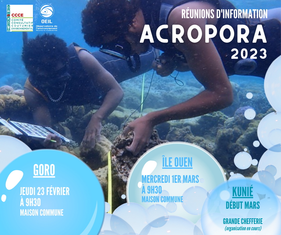 Avis aux populations de Yaté, de l'île Ouen et de l'île des Pins : vous êtes invités aux réunions d'information et d'échange organisées par le Comité Consultatif Coutumier Environnemental (CCCE) et les autorités coutumières sur la reprise du suivi des récifs du Sud avec le programme Acropora 2023 !