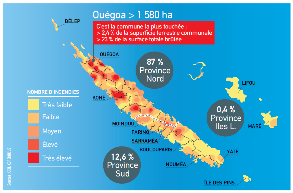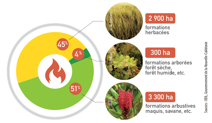 Les incendies sont une des principales menaces qui pèsent sur les milieux naturels en Nouvelle-Calédonie. En 2017, le premier bilan chiffré établi par l’OEIL rapportait 24 145 hectares brûlés, soit 1,3 % de la surface de la Nouvelle-Calédonie. L’année 2018 affiche un bilan presque quatre fois moindre avec 6 763 ha.