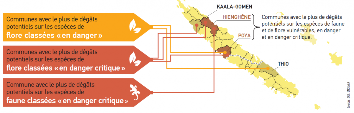 Le nombre d’espèces menacées impactées est vraisemblablement en-dessous de la réalité, car les travaux de prospection et d’évaluation des espèces sont en cours. Fin 2019, l’évaluation des espèces de lézards était en cours de révision ; quant à la flore, un tiers seulement des espèces connues à cette date avait fait l’objet d’une évaluation.