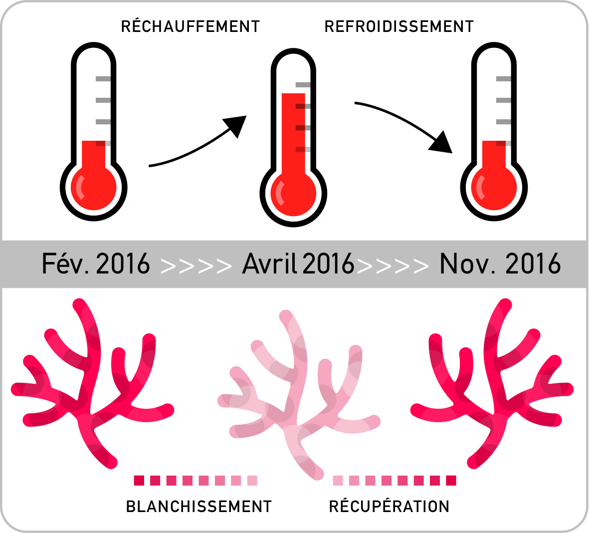 Un pic de chaleur, lié au phénomène climatique naturel El Niño, survenu de février à avril 2016, a entraîné un épisode de blanchissement des coraux dans l’ensemble du lagon calédonien. Dans le Grand Sud, les sites suivis n’ont pourtant pas été déclassés : en effet, sur les récifs surveillés par les bénévoles du programme ACROPORA, le taux de blanchissement n’a pas dépassé 2 % des récifs au large de Goro et de l’île des Pins.