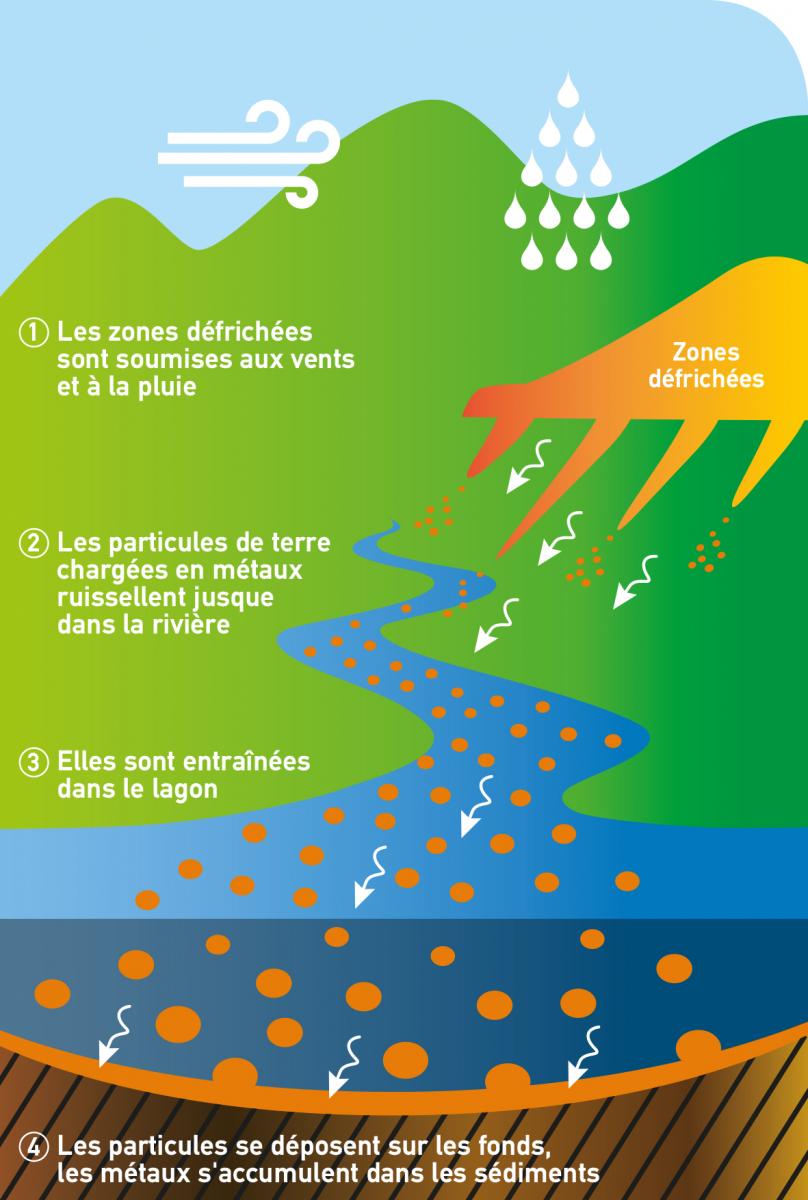 Manganèse, nickel, chrome, cobalt, fer… Tous ces éléments métalliques s’accumulent sur les fonds de la baie de Prony. Ils attestent d’une accentuation des apports terrigènes, naturellement chargés en métaux. Les défrichements intensifient ces apports de terre dans le lagon.
