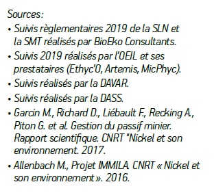L'état écologique des creeks et rivières montre une situation contrastée en 2019 : un quart des points de mesure était à sec au moment des prélèvements, ce qui impose de revoir leur positionnement, et un quart ne montrait aucune perturbation. Pour tous les autres, soit la moitié du réseau d’observation, les scores modérément à fortement perturbés soulignent principalement l’érosion des sols et le colmatage des cours d’eau dus aux anciennes pratiques minières, à l'exploitation actuelle, aux incendies à répétition et au développement d'espèces envahissantes telles que les cerfs et les cochons.