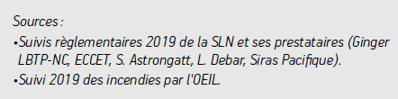 L’année 2019 a été marquée par de nombreux incendies dont un qui a sévèrement impacté la réserve naturelle de la forêt de Saille (voir p.5). La technique utilisée pour suivre les retombées de poussières dans l’air n’est pas comparable à celle utilisée par Scal’Air sur ses réseaux, et ne permet pas d’établir un score. Des valeurs particulièrement élevées ont toutefois été mesurées en bordure de RP10, nécessitant des investigations complémentaires. Les populations d’oiseaux suivies aux abords des sites miniers obtiennent un score perturbé, sauf autour de Thio Plateau. Des études spécifiques sur des espèces emblématiques sont menées par la SLN dans le cadre de ses obligations règlementaires. Elles montrent des populations stables de cagous, perruches à front rouge, lézards, et chauves-souris.