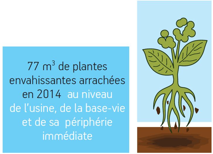 Un plan de lutte contre les espèces végétales introduites a été mis en place dans les secteurs envahis sous influence de Vale NC. En 2014, les opérations d’éradication ont été menées par l’industriel sur 10 hectares au sein du complexe industriel, aboutissant à l’arrachage de 77 m3 de végétaux. L’essentiel des eff orts s’est concentré sur la lutte contre l’arbuste envahissant Pluchea.
