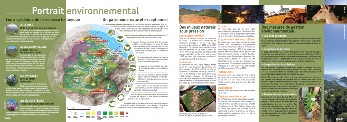 Cette première édition consacrée à Thio s'ouvre sur un portrait environnemental de la zone d'étude qui décrit la richesse de ses milieux naturels, les pressions qu'ils subissent et les réponses apportées. Pour comprendre les résultats qui suivent, il faut bien comprendre le contexte.