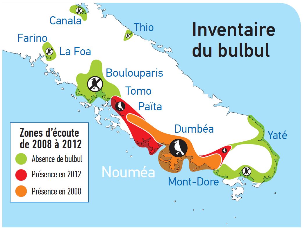 Afin de suivre la progression de l’oiseau, une équipe de recherche de l’Institut Agronomique néo-Calédonien (IAC), dirigée par Fabrice Brescia, étudie depuis 2008 la distribution géographique du bulbul en périphérie du Grand Nouméa. Les résultats de terrain obtenus grâce aux 200 points d’écoute permettent d’identifier une zone de présence du bulbul : depuis le Grand Nouméa, elle s’étend au nord jusqu’à Tomo et se prolonge au sud jusqu’à l’entrée du parc de la Rivière Bleue.