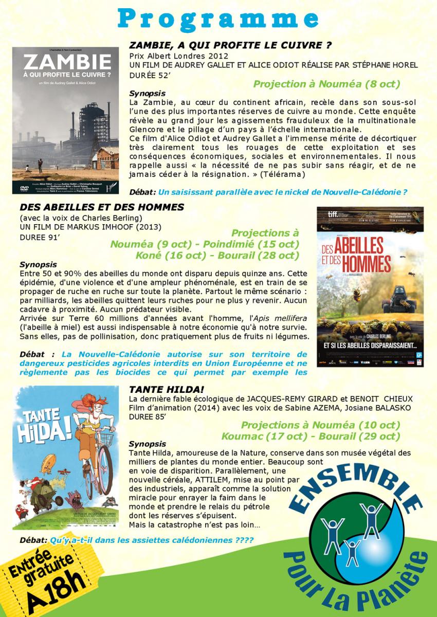 L'association Ensemble pour la planète (EPLP) organise la quatrième édition du Festival du Film Santé - Nature. Durant trois jours, les films seront projetés au Rex à Nouméa et suivront des projections en brousse (Poindimié, Koné, Koumac, Bourail).